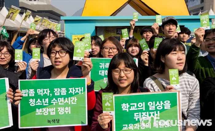 (서울=포커스뉴스) 21일 오전 서울 광화문 광장에서 열린 녹색당 교육(배움) 공약 발표 기자회견에 참석한 학생들이 '학교를 뒤집자, 배움에 숨통을'이 적힌 소형 손팻말을 들고 있다.