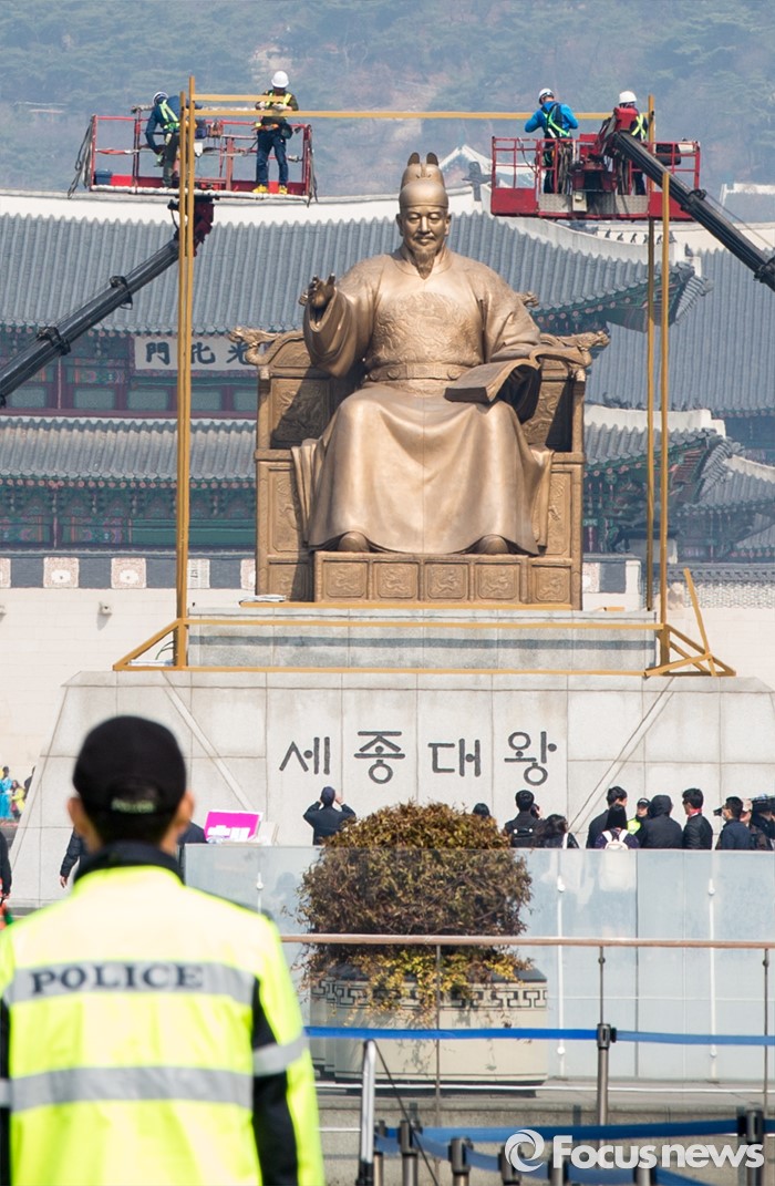 (서울=포커스뉴스) 21일 오전 서울 광화문 광장 세종대왕상에 한ㆍ불수교 130주년 기념 미술작품 '킹 오브 사인스'가 설치되고 있다.