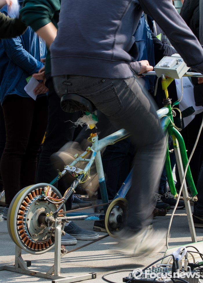 (서울=포커스뉴스) 21일 오전 서울 광화문 광장에서 열린 녹색당 교육(배움) 공약 발표 기자회견에 참석한 학생이 자전거형 발전기의 페달을 밟아 음향기기에 필요한 전력을 공급하고 있다.