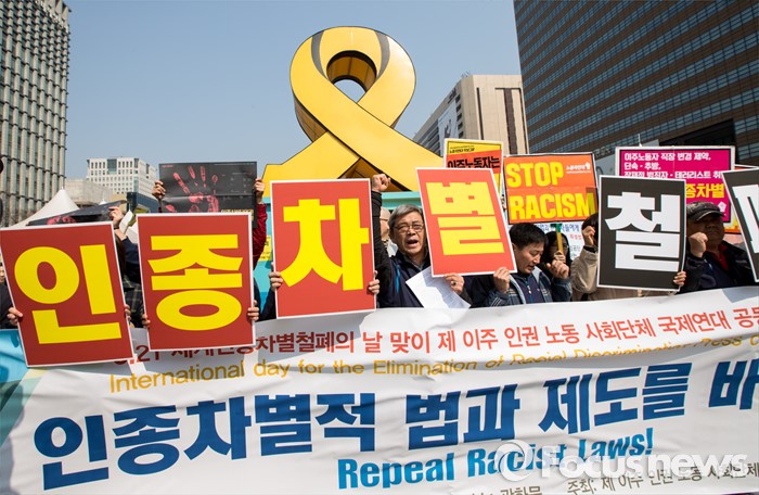 (서울=포커스뉴스) 21일 오전 서울 광화문 광장에서 열린 '세계인종차별철폐의 날 맞이 제 이주 인권 노동 사회단체 국제연대 공동 기자회견'에서 참석자들이 인종차별에 반대하는 손팻말을 들고 있다.