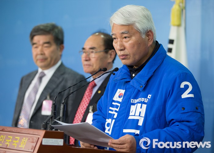 (서울=포커스뉴스) 경기도 용인갑 전략공천된 더불어민주당 백군기 의원이 21일 오후 서울 여의도 국회 정론관에서 기자회견을 하고 있다.