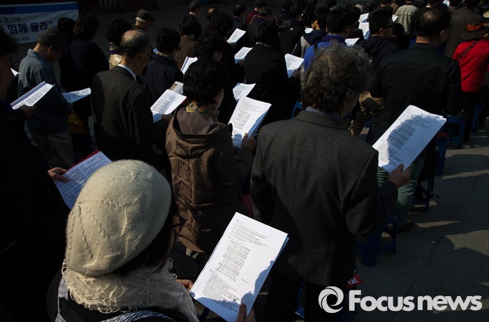 (서울=포커스뉴스) 21일 오후 서울 중구 덕수궁 대한문 앞에서 한국기독교 장로회 총회 '고난당하는 민주주의를 위한 시국기도회'가 열리고 있다.