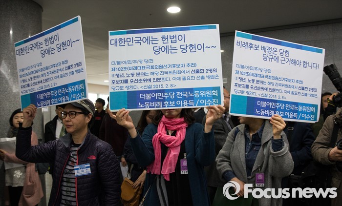 (서울=포커스뉴스) 21일 오후 서울 여의도 국회 의원회관에서 열린 더불어민주당 중앙위원회 회의실 앞에서 비례대표 예비 후보 관계자들이 김종인 셀프 공천과 관련해 피켓 시위를 하고 있다. 이날 더민주 중앙위는 오후 3시 열릴 예정이었으나, 두 차례 연기를 거듭해, 오후 8시 열기로 결정됐다.