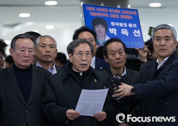 (서울=포커스뉴스) 더불어민주당이 비례대표 선정 문제를 놓고 진통을 겪고 있는 가운데 함세웅 신부(민주주의국민행동 상임대표)와 소속단체 대표들이 21일 국회 의원회관에서 예정된 더민주 중앙위원회의를 앞두고 김종인 대표의 '셀프 공천' 취소 및 공천안 전면 수정을 촉구하는 기자회견을 하고 있다. 이날 더민주 중앙위는 오후 3시 열릴 예정이었으나, 두 차례 연기를 거듭해, 오후 8시 열기로 결정됐다.