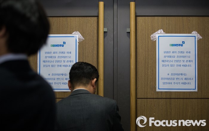 (서울=포커스뉴스) 더불어민주당 중앙위원회 회의가 비공개로 열릴 예정인 21일 오후 서울 여의도 국회 의원회관에서 한 관계자가 회의장 문을 닫고 있다. 이날 더민주 중앙위는 오후 3시 열릴 예정이었으나, 두 차례 연기를 거듭해, 오후 8시 열기로 결정됐다.