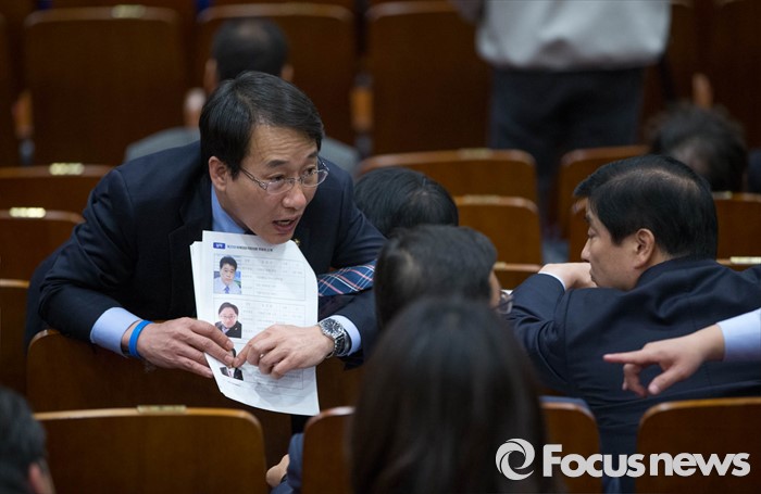 (서울=포커스뉴스) 비례대표 선정을놓고 김종인 비대위 대표가 당무를 거부하는 등 더불어민주당의 내홍이 계속되고 있는 가운데 22일 오전 서울 여의도 국회 의원회관에서 진행 중인 중앙위원회의에서 더민주 당원들이 비례대표 후보자들의 정견발표를 들으며 대화를 나누고 있다.