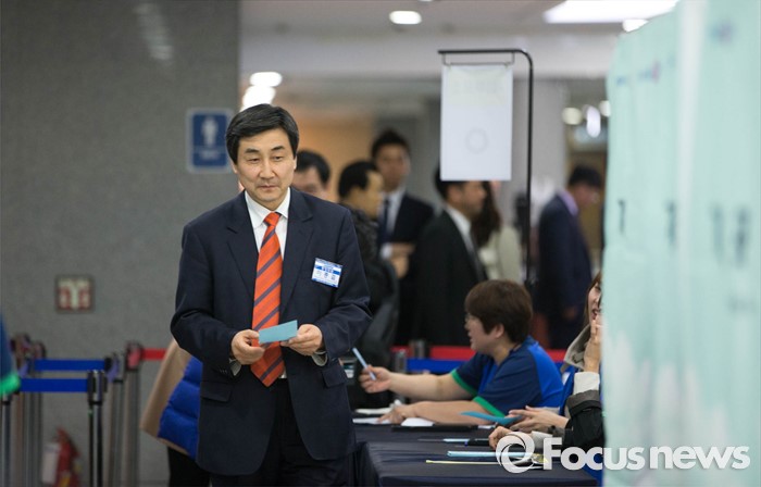 (서울=포커스뉴스) 비례대표 선정을놓고 김종인 비대위 대표가 당무를 거부하는 등 더불어민주당의 내홍이 계속되고 있는 가운데 22일 오전 서울 여의도 국회 의원회관에서 열린 중앙위원회의가 끝난 후 이종걸 원내대표가 투표를 위해 기표소로 향하고 있다.