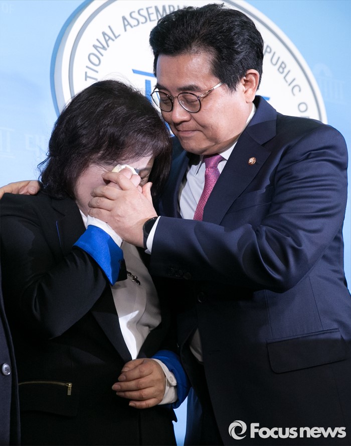 (서울=포커스뉴스) 20대 총선을 앞두고 공천 배제(컷오프)된 전병헌(오른쪽) 더불어민주당 의원이 22일 오전 서울 여의도 국회 정론관에서 대선승리를 위한 백의종군 선언 기자회견 도중 아내 조영하 씨를 위로하고 있다.