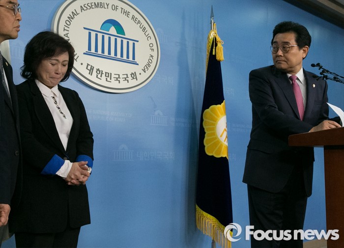(서울=포커스뉴스) 20대 총선을 앞두고 공천 배제(컷오프)된 전병헌(오른쪽) 더불어민주당 의원이 22일 오전 서울 여의도 국회 정론관에서 대선승리를 위한 백의종군 선언 기자회견 도중 슬퍼하는 아내 조영아 씨를 바라보고 있다.