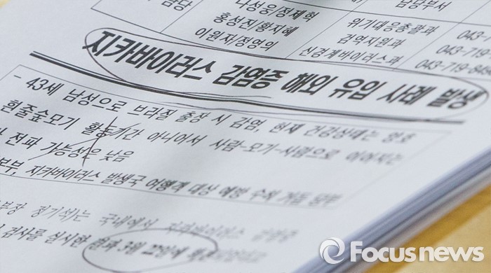 (서울=포커스뉴스) 22일 오전 서울 종로구 정부서울청사에서 열린 '지카바이러스 감염증 해외 유입사례 발생' 관련 브리핑에 참석한 정기석 질병관리본부장의 보도자료.