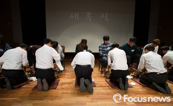 (서울=포커스뉴스) 22일 오후 서울 서대문구 명지대학교 세족식 행사에서 유병진 총장을 비롯한 교직원들이 학생들의 발을 씻겨주고 있다.