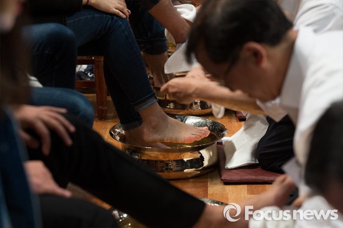 (서울=포커스뉴스) 22일 오후 서울 서대문구 명지대학교 세족식 행사에서 유병진 총장을 비롯한 교직원들이 학생들의 발을 씻겨주고 있다.