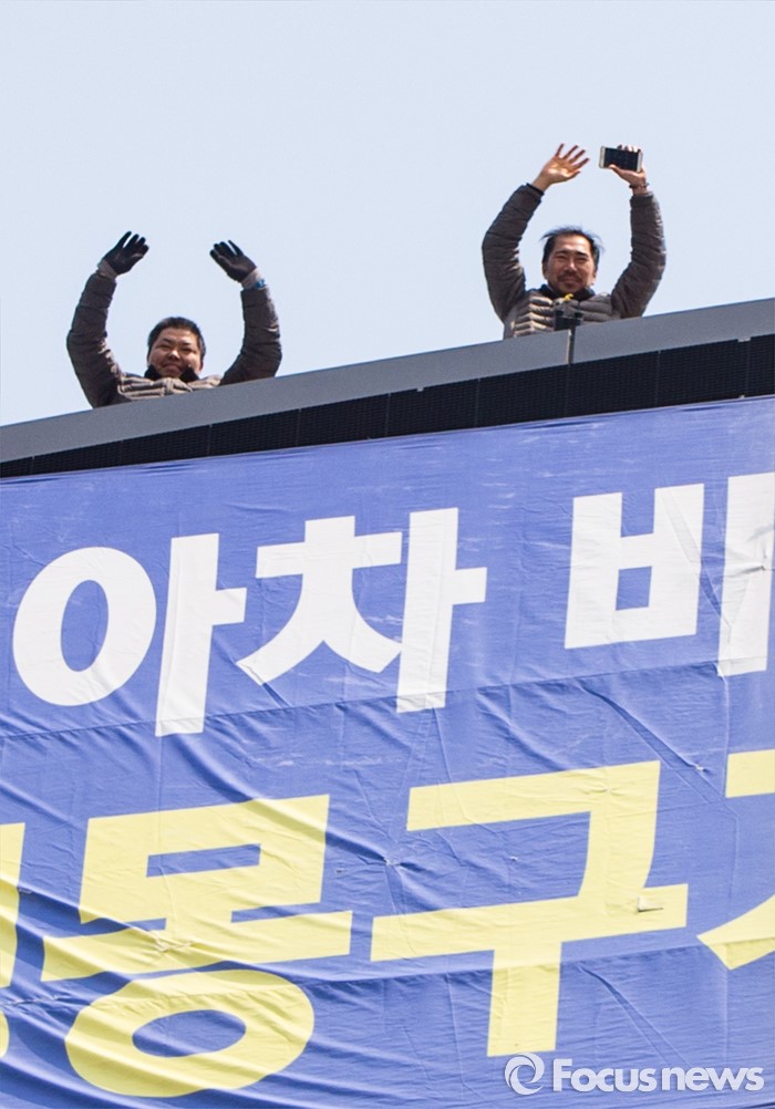 (서울=포커스뉴스) 22일 오전 서울광장 맞은편 구 인권위원회 건물 옥상 광고탑에서 고공농성을 284일째 이어가고 있는 기아차 사내하청 비정규직 노동자 한규협 최정명씨가2016 비정규직 총선연대 발족식 참석자들을 향해 송을 흔들고 있다.