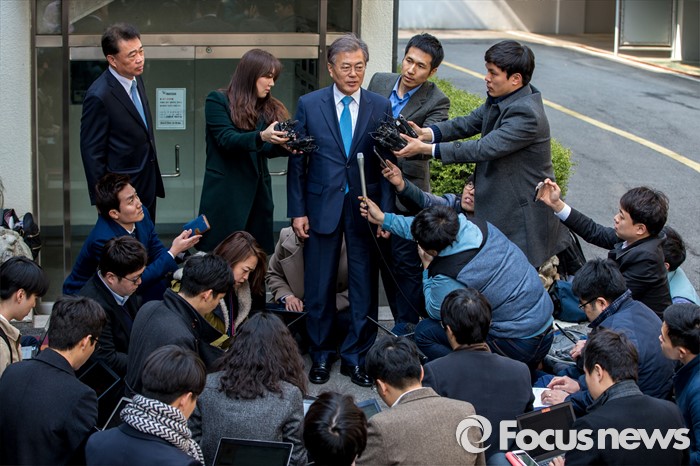 (서울=포커스뉴스) 문재인 전 더불어민주당 대표가 김종인 비상대책위 대표와 면담을 마친 22일 오후 서울 종로구 김 대표 자택을 나서며 취재진 질문에 답하고 있다.