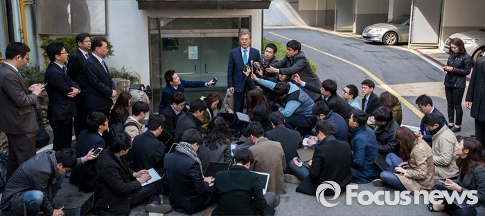 (서울=포커스뉴스) 문재인 전 더불어민주당 대표가 김종인 비상대책위 대표와 면담을 마친 22일 오후 서울 종로구 김 대표 자택을 나서며 취재진 질문에 답하고 있다.