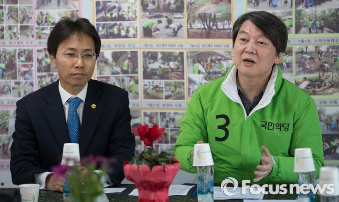 (서울=포커스뉴스) 안철수 국민의당 상임공동대표(오른쪽)와 김광수 서울시의원이 22일 오후 서울 노원구 상계동 김광수 서울시의원 사무실에서 지역상공인들과 대화의 시간을 갖고 있다.