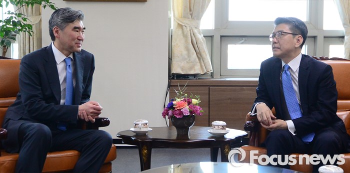 (서울=포커스뉴스) 성김(왼쪽) 국무부 대북정책특별대표와 김홍균 한반도평화교섭본부장이 22일 서울 종로구 외교부에서 열린 '한·미 북핵 6자회담'에 참석해 대화를 나누고 있다.