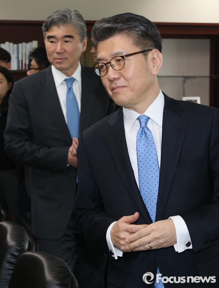 (서울=포커스뉴스) 성김 국무부 대북정책특별대표와 김홍균 한반도평화교섭본부장이 22일 서울 종로구 외교부에서 열린 '한·미 북핵 6자회담'에 참석해 자리로 향하고 있다.