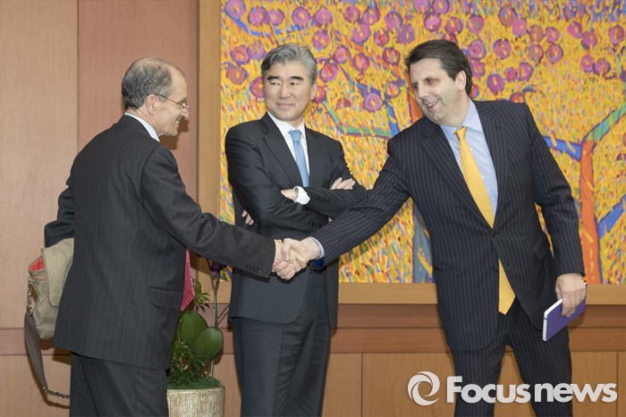 (서울=포커스뉴스) 대니얼 프리드(왼쪽부터) 미 국무부 제재정책조정관, 성김 미 국무부 대북정책특별대표, 마크 리퍼트 주한미국대사가 22일 오후 서울 종로구 외교부에서 만나 윤병세 외교부 장관을 만나기에 앞서 인사를 나누고 있다.