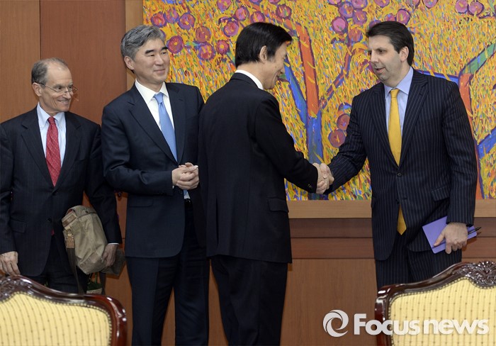 (서울=포커스뉴스)윤병세(왼쪽 세번째) 외교부 장관이 22일 오후 서울 종로구 외교부 청사에서 마크 리퍼트(오른쪽) 주한미국 대사, 성김(왼쪽 두번째) 미 대북정책 특별대표, 대니얼 프리드 제재정책조정관을 접견, 인사를 하고 있다.