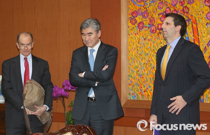 (서울=포커스뉴스) 22일 오후 서울 종로구 외교부에서 대니얼 프리드(왼쪽부터) 미 국무부 제재정책조정관, 성김 미 국무부 대북정책특별대표, 마크 리퍼트 주한미국대사가 대기하고 있다.