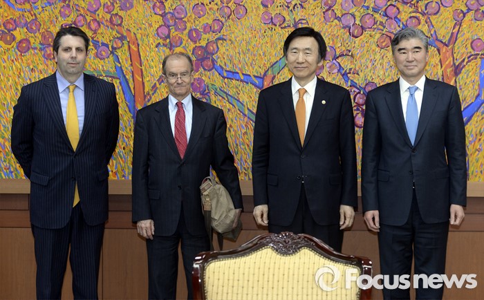 (서울=포커스뉴스)윤병세(오른쪽 두번재) 외교부 장관이 22일 오후 서울 종로구 외교부 청사에서 성김(오른쪽) 미 대북정책 특별대표, 대니얼 프리드(오른쪽 세번째) 제재정책조정관, 마크 리퍼트 주한미국 대사를 접견, 기념촬영을 하고 있다.