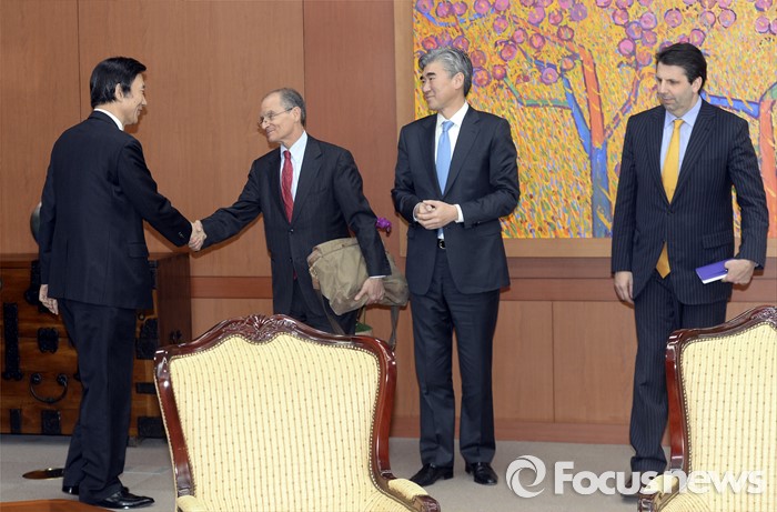 (서울=포커스뉴스)윤병세(왼쪽) 외교부 장관이 22일 오후 서울 종로구 외교부 청사에서 대니얼 프리드(왼쪽 두번재) 제재정책조정관, 성김(왼쪽 세번째) 미 대북정책 특별대표, 마크 리퍼트 주한미국 대사를 접견, 인사를 하고 있다.
