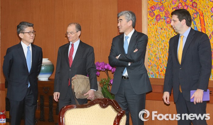 (서울=포커스뉴스) 김홍균 한반도평화교섭본부장이 22일 오후 서울 종로구 외교부에서 대니얼 프리드 미 국무부 제재정책조정관, 성김 미 국무부 대북정책특별대표, 마크 리퍼트 주한미국대사와 만나 대화를 나누고 있다.