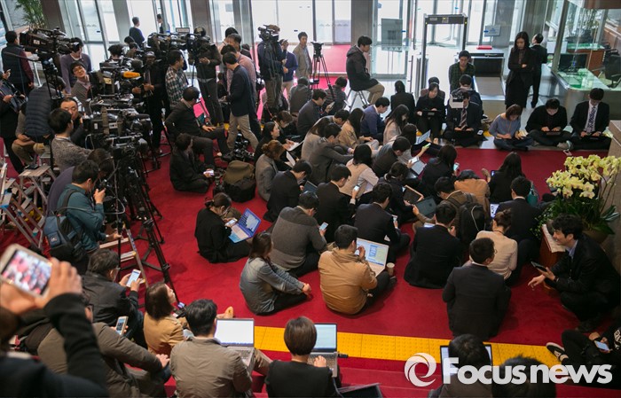 (서울=포커스뉴스) 22일 오후 서울 여의도 국회에서 취재진이 비공개 회의에 참석한 김종인 더불어민주당 비대위 대표를 기다리고 있다.