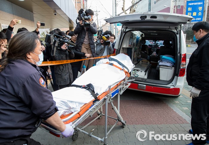 (서울=포커스뉴스) 22일 오후 서울 동대문구 휘경파출소 소속 경위가 2층 숙직실에서 권총 자살한 사건이 발생했다. 이날 사건이 발생한 파출소에서 구급대원이 시신을 구급차로 옮기고 있다.