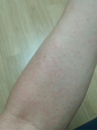 (서울=포커스뉴스)22일 질병관리본부가 공개한 지카바이러스 양성 판정을 받은 L(43)씨의 지난 21일 발진 사진. 질병관리본부는 현재 L씨는 발열이 없고 발진이 가라앉아 호전 중이라고 밝혔다. <사진제공=질병관리본부>