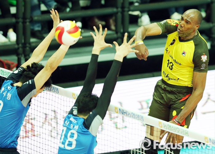 (안산=포커스뉴스) 22일 안산상록수체육관에서 열린 2015-2016 V-리그 남자부 챔피언결정전 3차전 OK저축은행-현대캐피탈 경기에서 OK저축은행 시몬이 현대캐피탈 박주형, 신영석의 블로킹을 뚫는 스파이크를 날리고 있다.