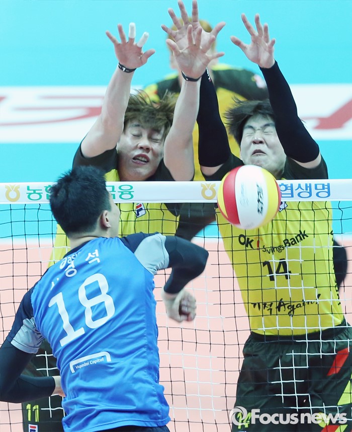(안산=포커스뉴스) 22일 안산상록수체육관에서 열린 2015-2016 V-리그 남자부 챔피언결정전 3차전 OK저축은행-현대캐피탈 경기에서 OK저축은행 박원빈과 송희채가 현대캐피탈 신영석의 스파이크를 블로킹으로 넘기고 있다.