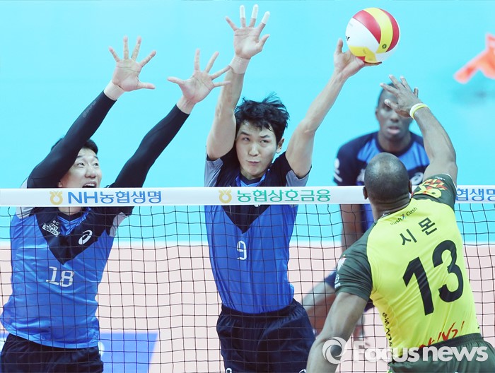 (안산=포커스뉴스) 22일 안산상록수체육관에서 열린 2015-2016 V-리그 남자부 챔피언결정전 3차전 OK저축은행-현대캐피탈 경기에서 OK저축은행 시몬의 연타 공격에 현대캐피탈 신영석(18)과 박주형이 블로킹을 대고 있다.
