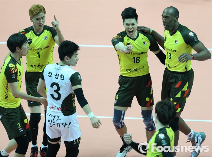 (안산=포커스뉴스) 22일 안산상록수체육관에서 열린 2015-2016 V-리그 남자부 챔피언결정전 3차전 OK저축은행-현대캐피탈 경기에서 OK저축은행 한상길(18)이 공격을 성공시키고 동료들과 환호하고 있다.