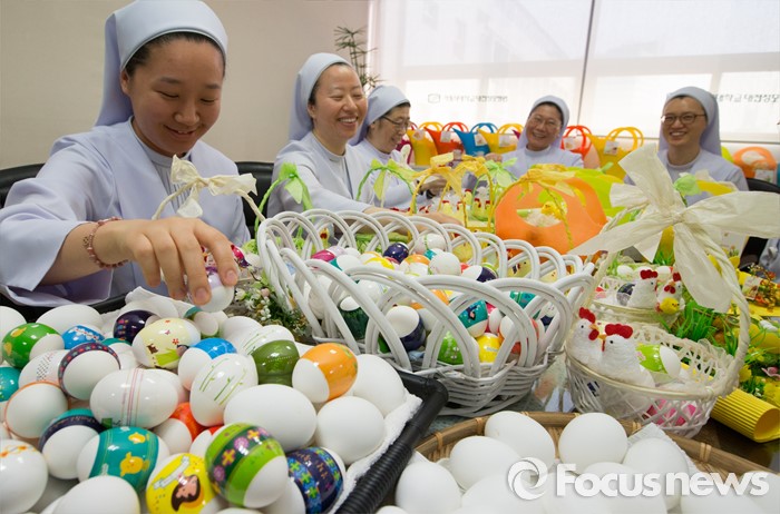 (대전=포커스뉴스) 부활절을 앞두고 23일 오전 대전 중구 가톨릭대학교 대전성모병원 원목팀 수녀들이 정성스럽게 꾸민 달걀을 바구니에 담고 있다. 이날 가톨릭대학교 대전성모병원 직원들은 생명의 탄생을 의미하는 부활 달걀 총 3000여개를 병동의 환자 및 보호자, 지역주민들에게 전달했다.