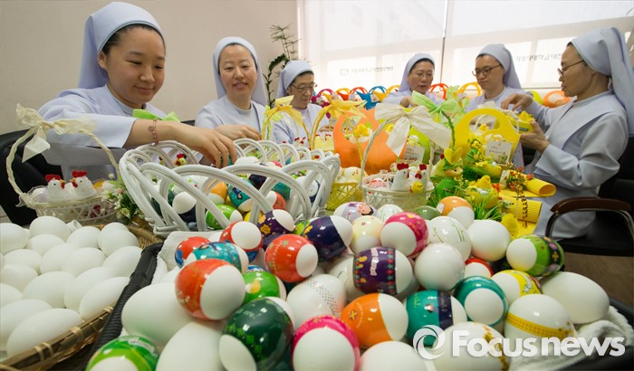(대전=포커스뉴스) 부활절을 앞두고 23일 오전 대전 중구 가톨릭대학교 대전성모병원 원목팀 수녀들이 정성스럽게 꾸민 달걀을 바구니에 담고 있다. 이날 가톨릭대학교 대전성모병원 직원들은 생명의 탄생을 의미하는 부활 달걀 총 3000여개를 병동의 환자 및 보호자, 지역주민들에게 전달했다.