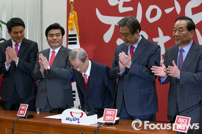 (서울=포커스뉴스) 강봉균(가운데) 새누리당 공동선대위원장이 23일 오전 서울 여의도 국회에서 열린 최고위원회의에 참석해, 인사를 하고 있다.