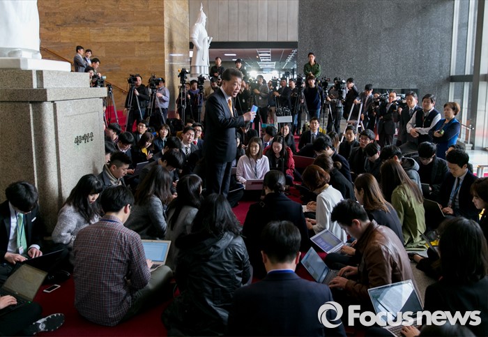 (서울=포커스뉴스) 23일 오전 서울 여의도 국회 로텐더홀에서 김성수 더불어민주당 대변인이 김종인 비대위 대표 거취 등 비공개 회의 결과를 기다리는 취재진에게 브리핑을 하고 있다.
