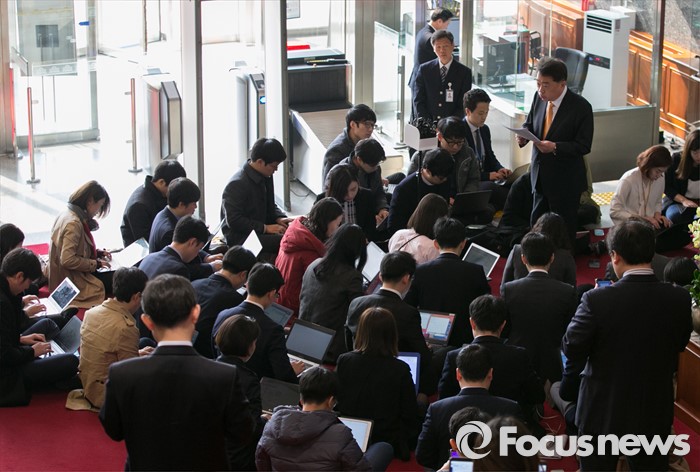 (서울=포커스뉴스) 23일 오전 서울 여의도 국회 로텐더홀에서 김성수 더불어민주당 대변인이 김종인 비대위 대표 거취 등 비공개 회의 결과를 기다리는 취재진에게 브리핑을 하고 있다.