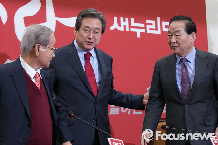 (서울=포커스뉴스) 김무성(가운데) 새누리당 대표가 23일 오전 서울 여의도 국회에서 열린 최고위원회의에 참석해, 강봉균(왼쪽) 공동선대위원장을 서청원 최고위원에게 소개하고 있다.