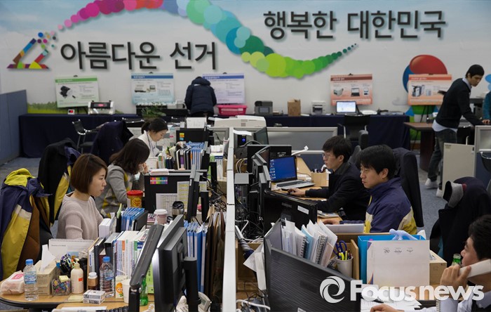 (과천=포커스뉴스) 20대 총선 후보자 등록을 하루 앞둔 23일 오전 경기도 정부 과천 청사 선거 상황실에서 근무자들이 업무에 열중하고 있다.