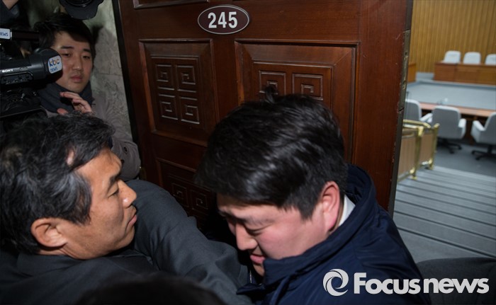 (서울=포커스뉴스) 23일 오전 서울 여의도 국회에서 열린 국민의당 비공개 최고위원회의 도중 공천탈락 후 결선투표를 주장하고 있는 김승남 의원과 지지자들이 회의장 진입을 시도하며 당직자들에게 항의하고 있다.
