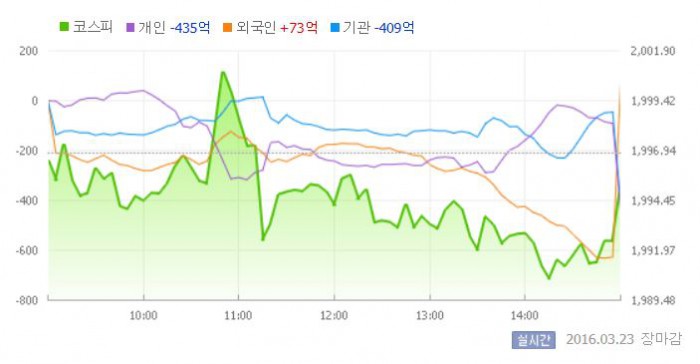 이날 코스피는 전일대비 0.02% 하락한 1996.47로 장을 시작했다. 이후 지수는 외국인과 기관의 동반 매도세에 하락폭을 확대했다. 그러나 장 막판 외국인이 순매수로 돌아서면서 1990선 중반에서 마감했다.