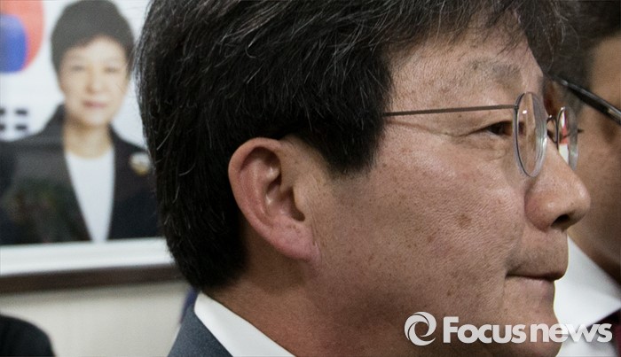 (대구=포커스뉴스) 23일 오후 대구 동구 용계동 사무소에서 새누리당 탈당 및 무소속 출마 기자회견에 앞서 지지자들과 인사를 나누는 유승민 의원 뒤로 박근혜 대통령의 사진이 보이고 있다.