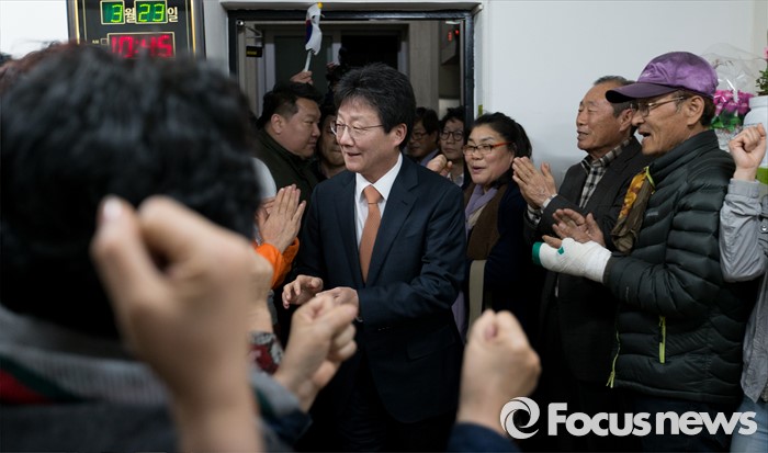 (대구=포커스뉴스) 유승민 의원이 23일 오후 대구 동구 용계동 사무소에서 새누리당 탈당 및 무소속 출마 기자회견에 앞서 지지자들과 악수를 나누고 있다.