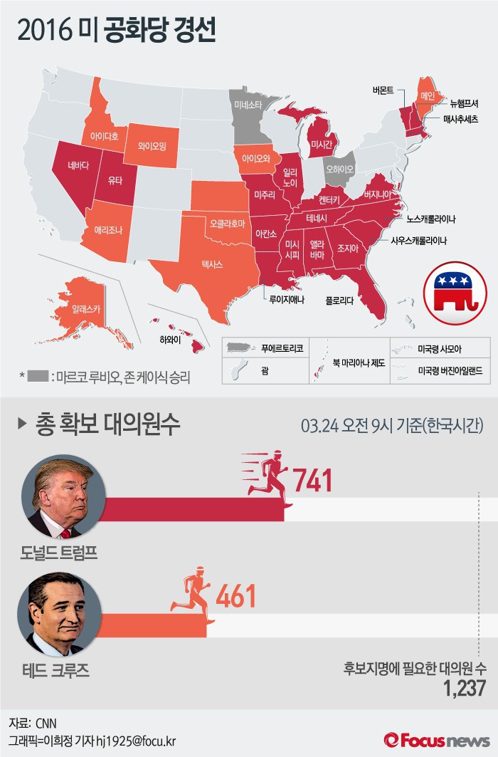 (서울=포커스뉴스) 미국 워싱턴포스트 등 외신은 22일(현지시간) 공화당 도널드 트럼프가 가장 큰 경선 지역인 애리조나에서 승리했다고 밝혔다. 유타주에서는 크루즈 의원이 압도적인 지지율로 승리했다.