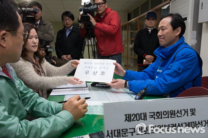 (서울=포커스뉴스) 24일 오전 서울 서대문구 선거관리위원회에서 우상호 더불러민주당 전 의원이 20대 총선 국회의원 후보 등록 서류를 제출하며 기념촬영을 하고 있다.