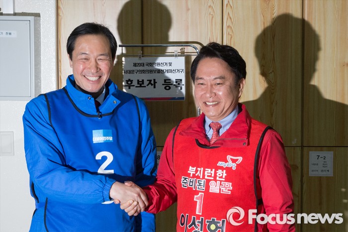 (서울=포커스뉴스) 24일 오전 서울 서대문구 선거관리위원회에서 우상호(왼쪽) 더불러민주당 전 의원과 이성헌 새누리당 전 의원이 20대 총선 국회의원 후보 등록 후 기념촬영하고 있다.