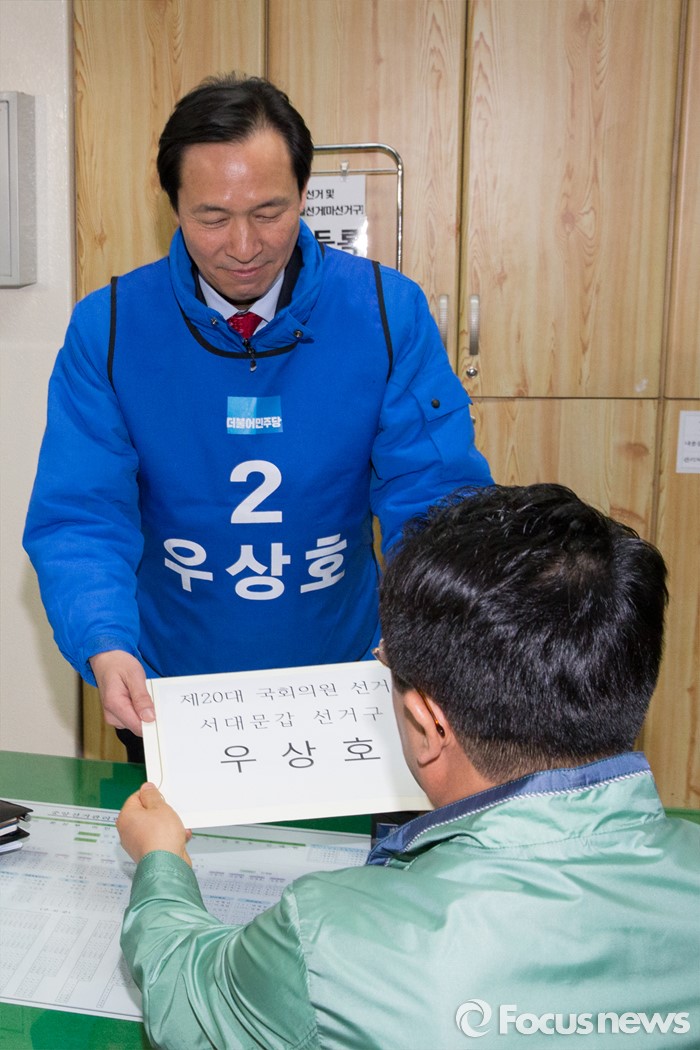 (서울=포커스뉴스) 24일 오전 서울 서대문구 선거관리위원회에서 우상호 더불러민주당 전 의원이 20대 총선 국회의원 후보 등록 서류를 제출하고 있다.